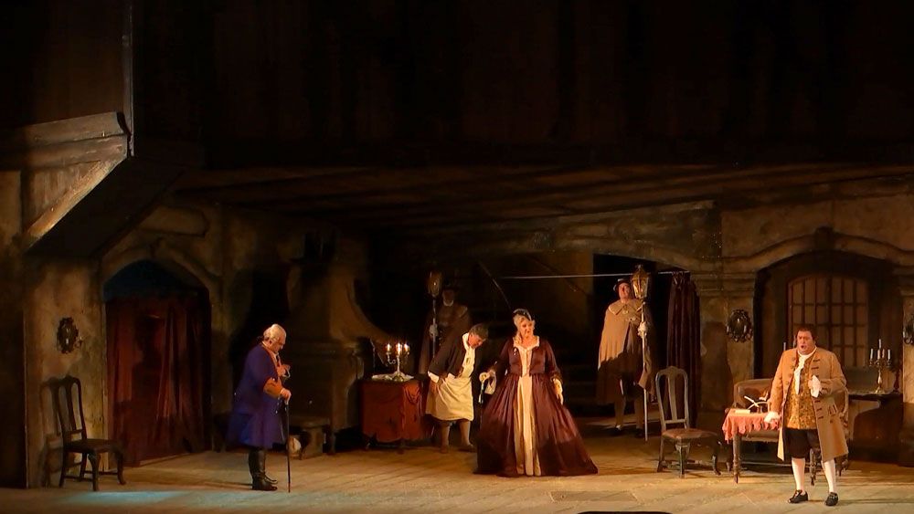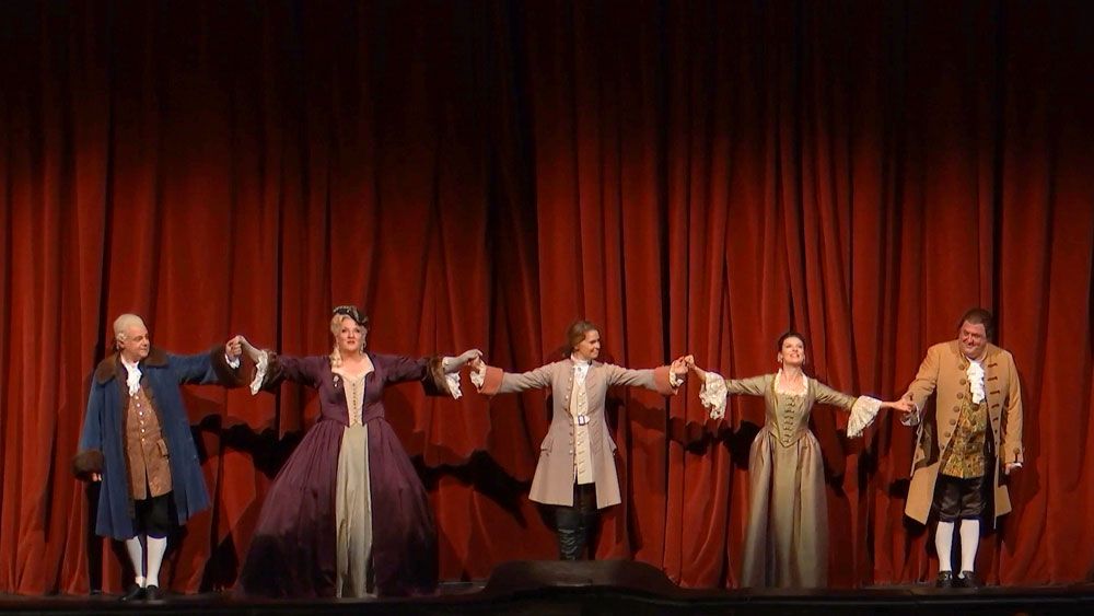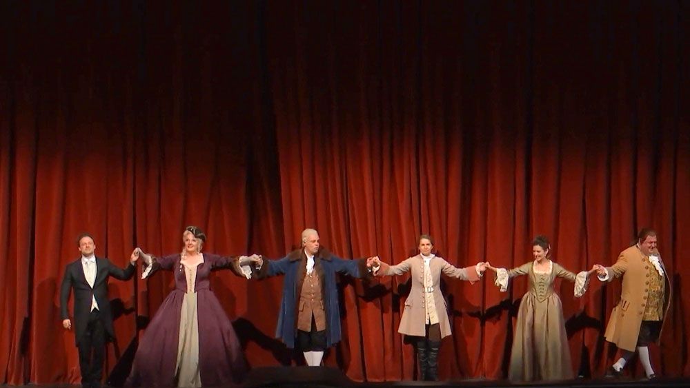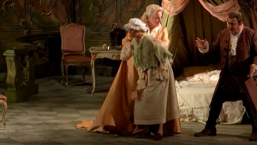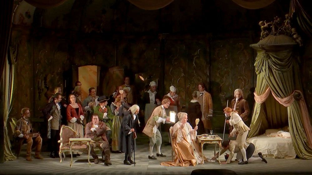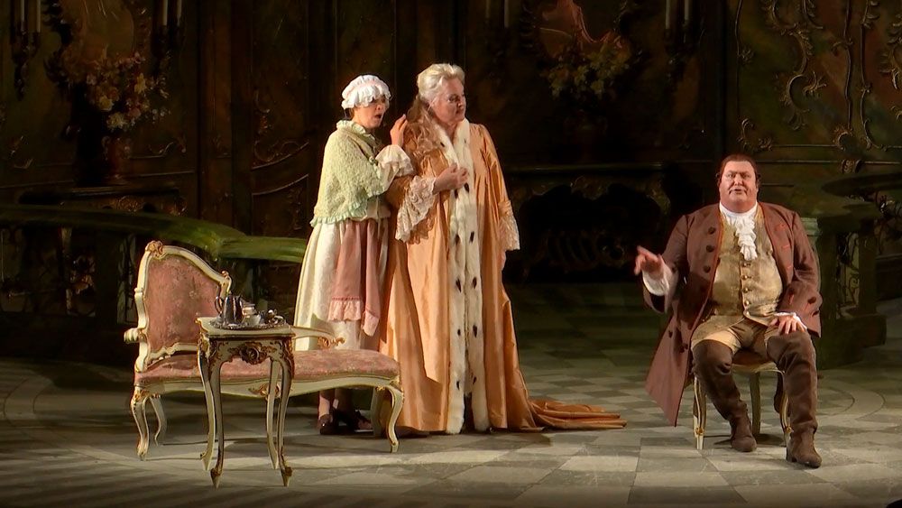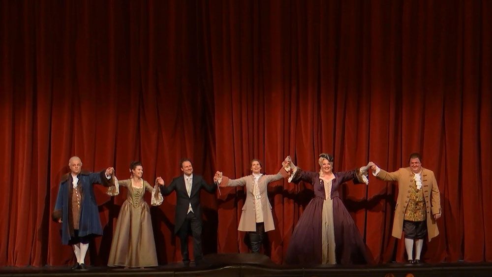 Es dirigierte Sascha Goetzel (links), als Faninal war Jochen Schmekenbecher (im blauen Umhang) zu hören. Daniela Fally sang die Sophie (mitte) und Peter Rose den Baron Ochs.