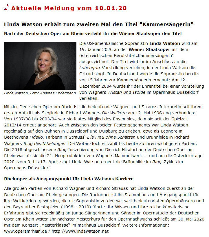 "Klassik heute" erwähnt den deutschen Titel "Kammersängerin", der Linda Watson bereits vor 15 Jahren verliehen wurde: